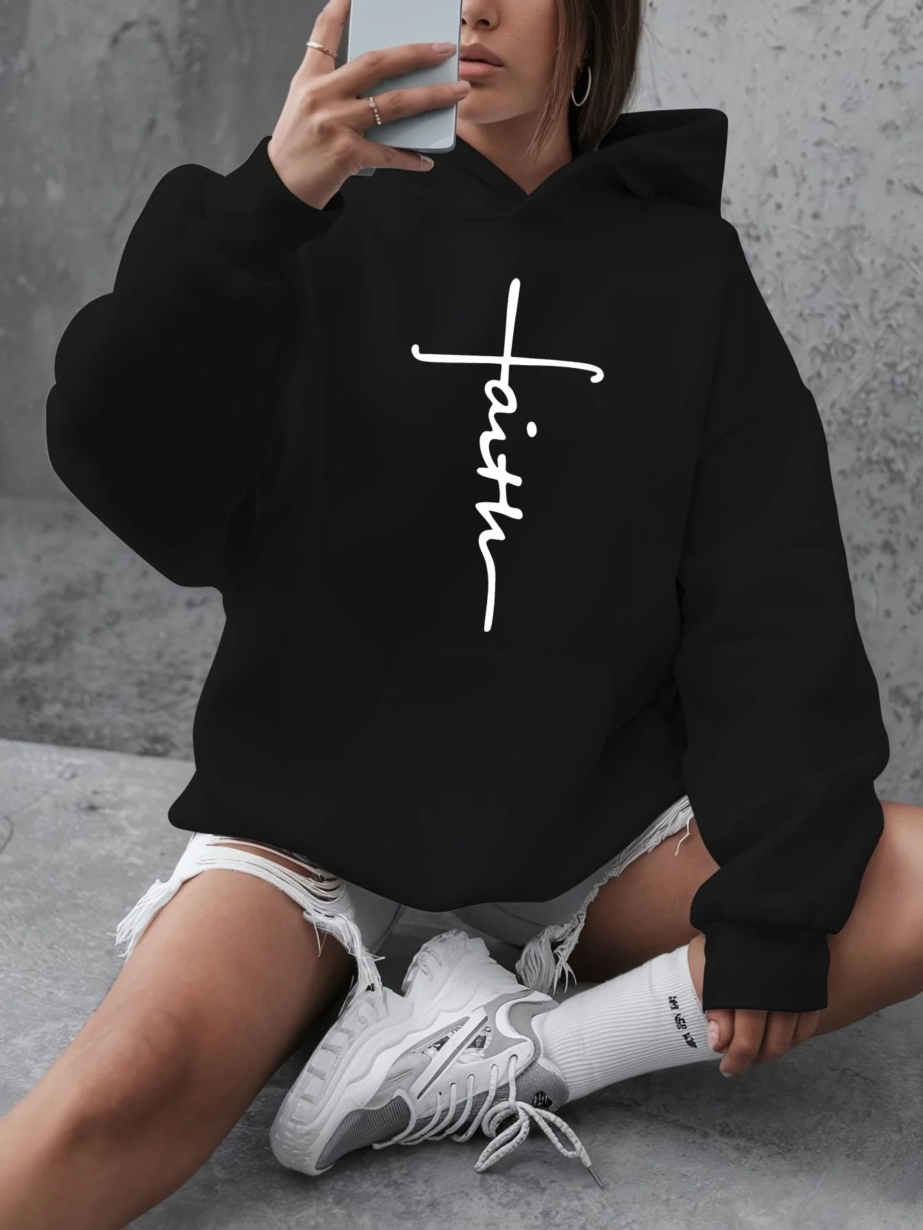Casual hooded sweatshirt, with the word "Faith" printed on it. Autumn/Winter pure cotton knitted long-sleeved sweatshirt.