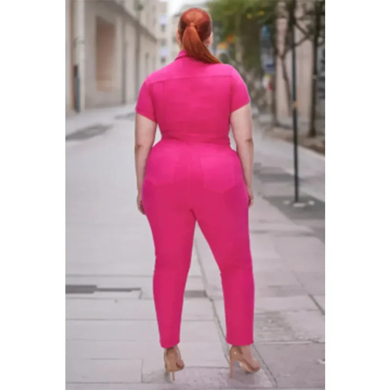 Fashion Jeans Plus Size Denim Jump Suits for Women Slim Short Sleeve Turn Down Collar Overalls Rompers Female One-piece Pants