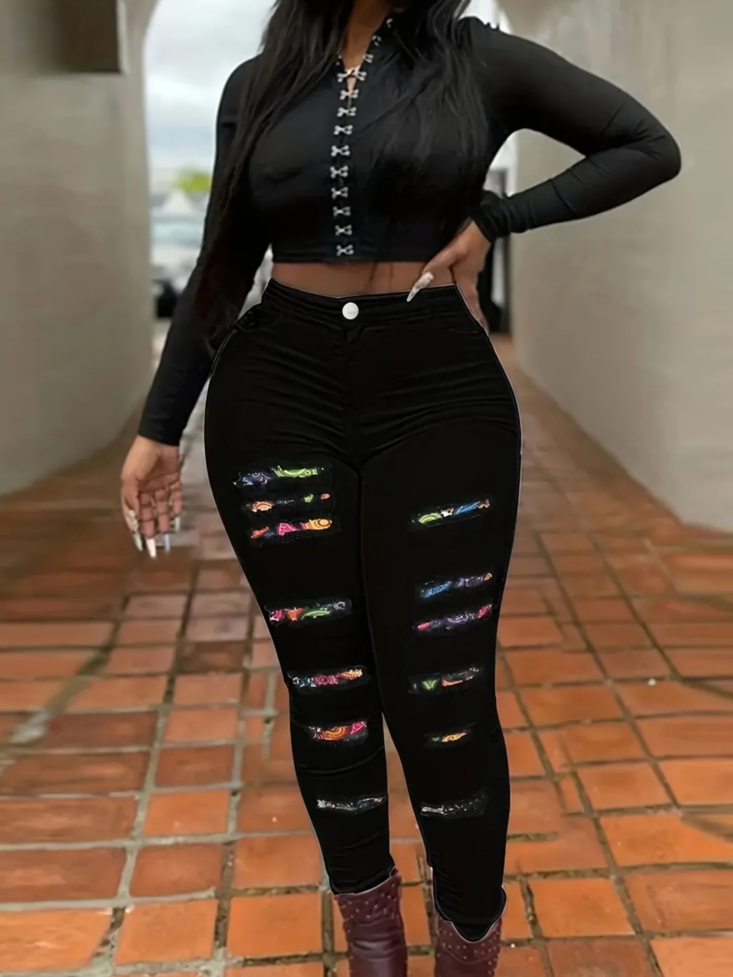 Women's plus size American sexy jeans, high stretch slim-fit pencil jeans, black color-blocked ripped slim-fit jeans